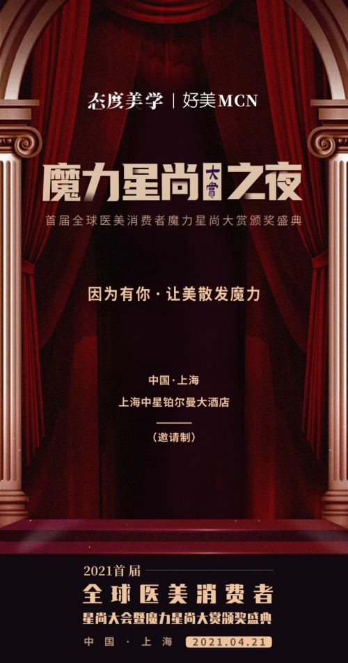 2021年4月21日,全球医美消费者星尚大会暨魔力星尚大赏颁奖盛典,将在上海重磅启动,本次大会由医美综艺《女魔头驾到》创始人郝格女士发起,态度美学和好美MCN共同主办,医美行业内参全程战略媒体推广,百家时尚媒体、KOL联合传播。