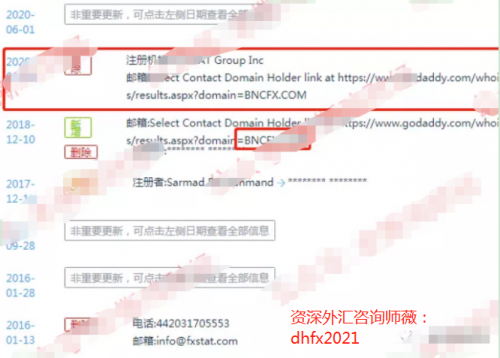 其实bncfx.com域名在2020年1月之前,都是由一家名叫FX Stat Group Inc的公司持有的,在2020年没有续费以后,被别人抢注下来了,然后在2020年6月1日的时候,又更新了一次注册信息,应该是被目前BNC领航国际的项目方买走了!!