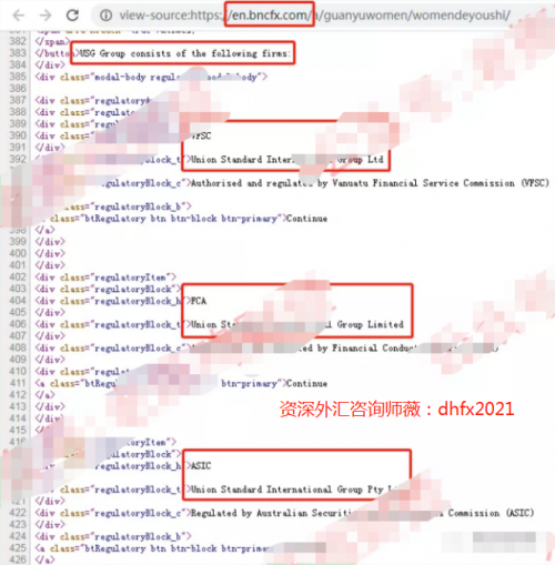 而且更奇葩的是,在其网页源代码中,BNC自称为USG Group,还拥有瓦鲁阿图VFSC的牌照,英国FCA的牌照,澳大利亚ASIC的牌照,甚至连USG的公司全名Union Standard International Group Ltd都全抄过来了!!