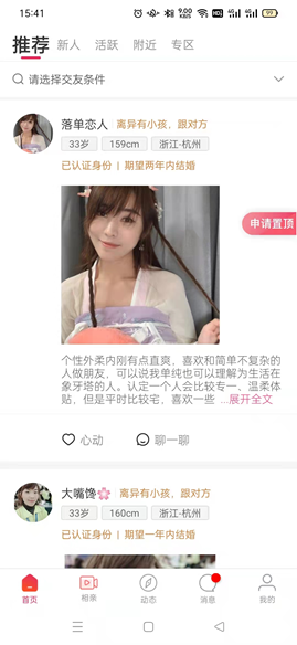 为了让各位交友更加放心,每一位梅花婚恋的新用户都需要通过真人实名认证,为每一个人的婚恋交友负责。其次,用户在注册平台时,需完善其个人真实的资料,及标签与动态,让你的匹配交友更细化,对60、70、80、90后这四个标签进行分类找寻,更容易遇到心仪的ta。在梅花婚恋APP的首页上还会每天智能推荐最符合自己的嘉宾,节省更多时间,结识更多志趣相投的人。除此之外梅花婚恋App仅针对再婚和能接受再婚的用户群体,并且平台上的所有会员全部都是经过严格认证的优质离异单身。看到心仪的对象,点击照片下面的“心动”加以收藏,也可以直接点击“聊一聊”与其对话。