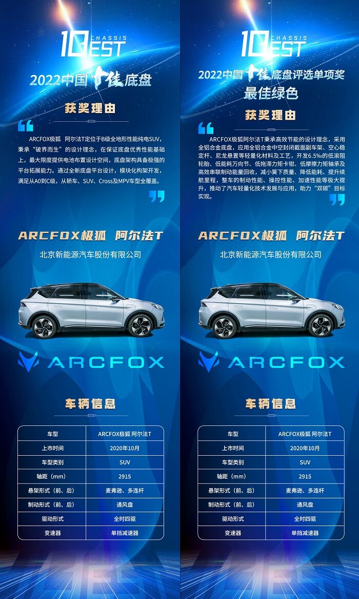 好的底盘,能够兼顾操控性和舒适性,让驾乘者拥有更高品质的体验。此次十佳底盘评选,从材料、工艺、结构等维度,针对消费者购车时最关注的安全、舒适、操控等指标进行全方位评价。而极狐阿尔法T斩获“2022中国十佳底盘”及“最佳绿色”奖,既是极狐自身实力的体现,也是行业和消费者对极狐一直以来追求极致驾乘体验的高度肯定。